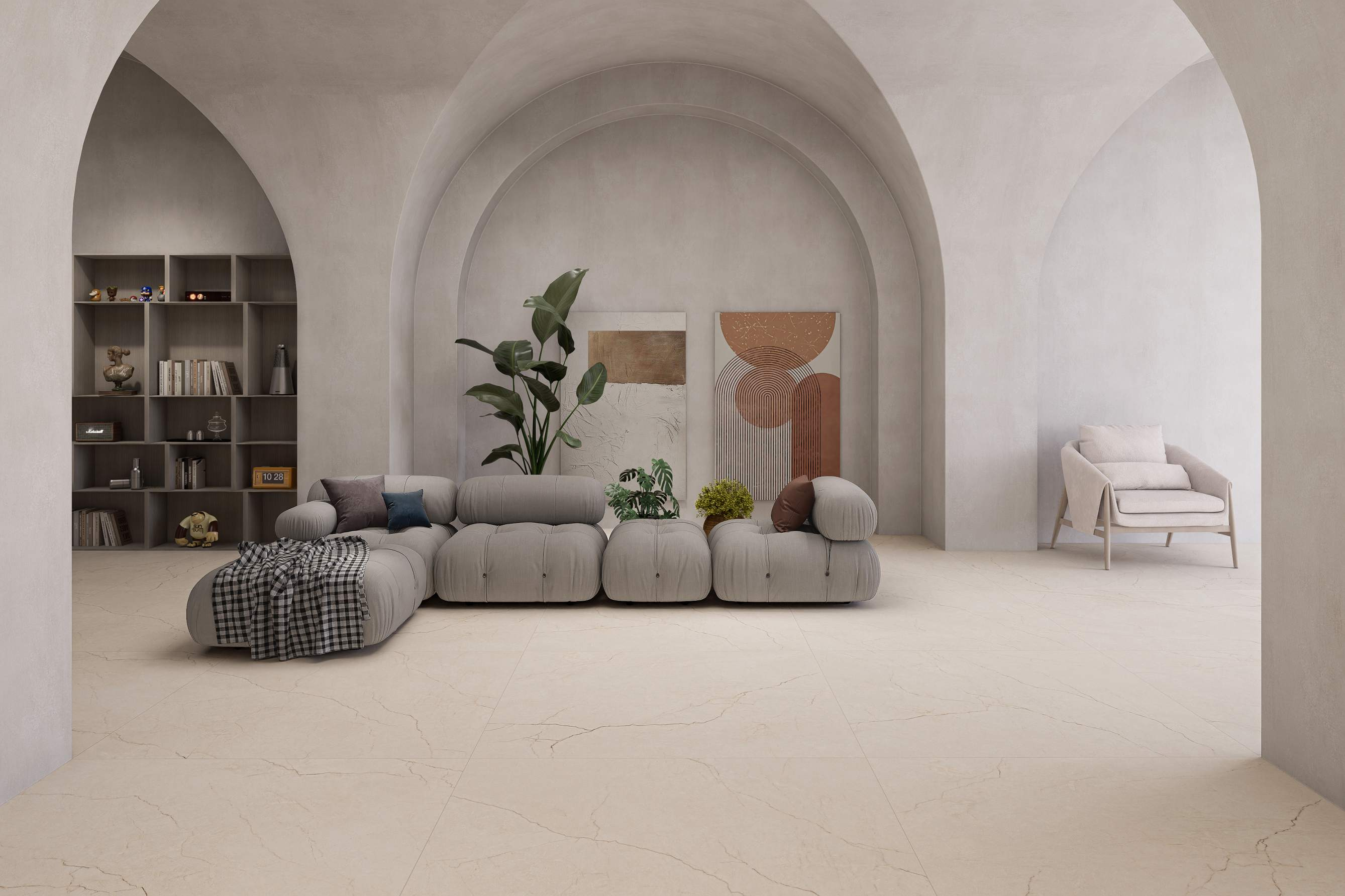 안정감 있는 미디엄 베이지 컬러에 클래식한 보티치노 마블 결을 더한 타일로,