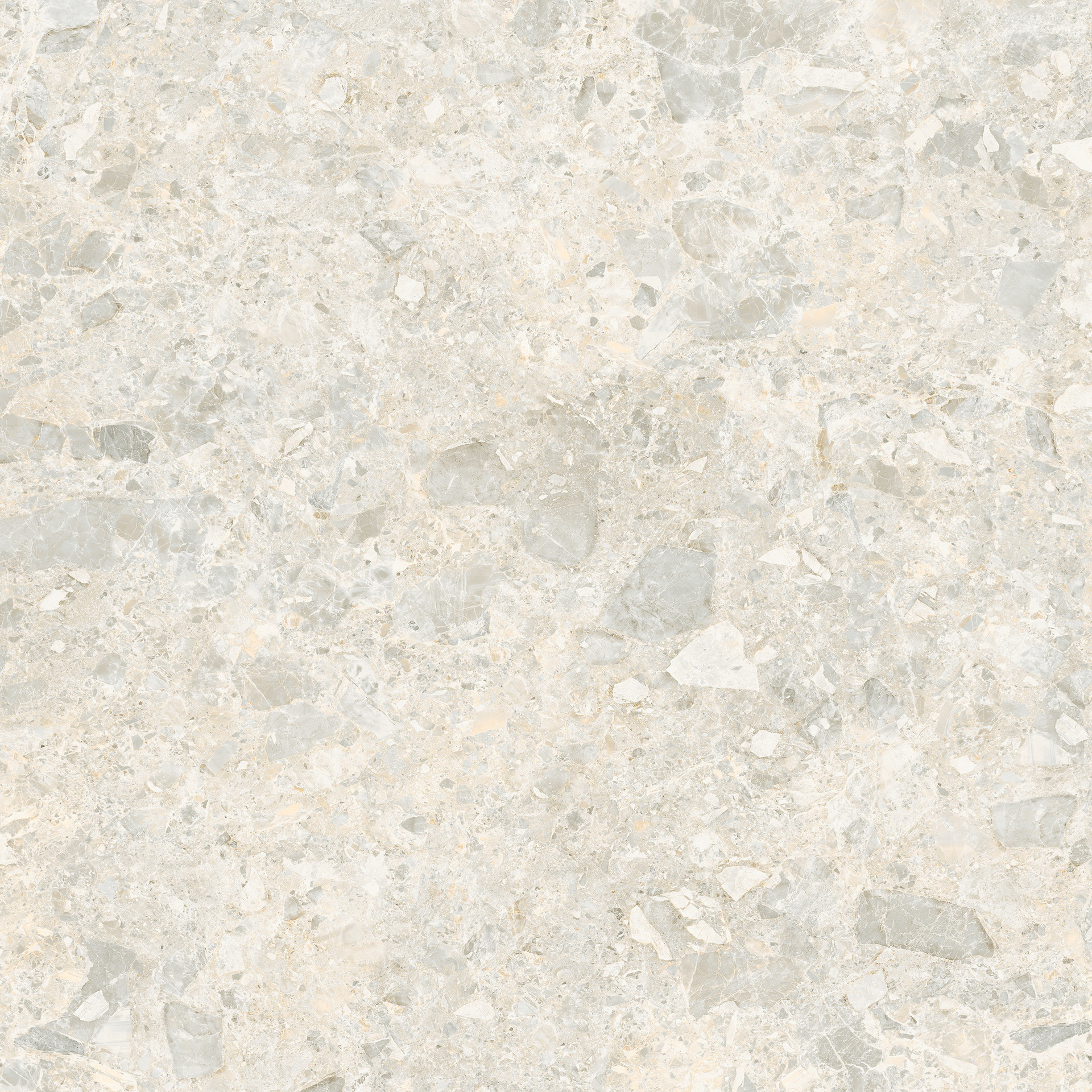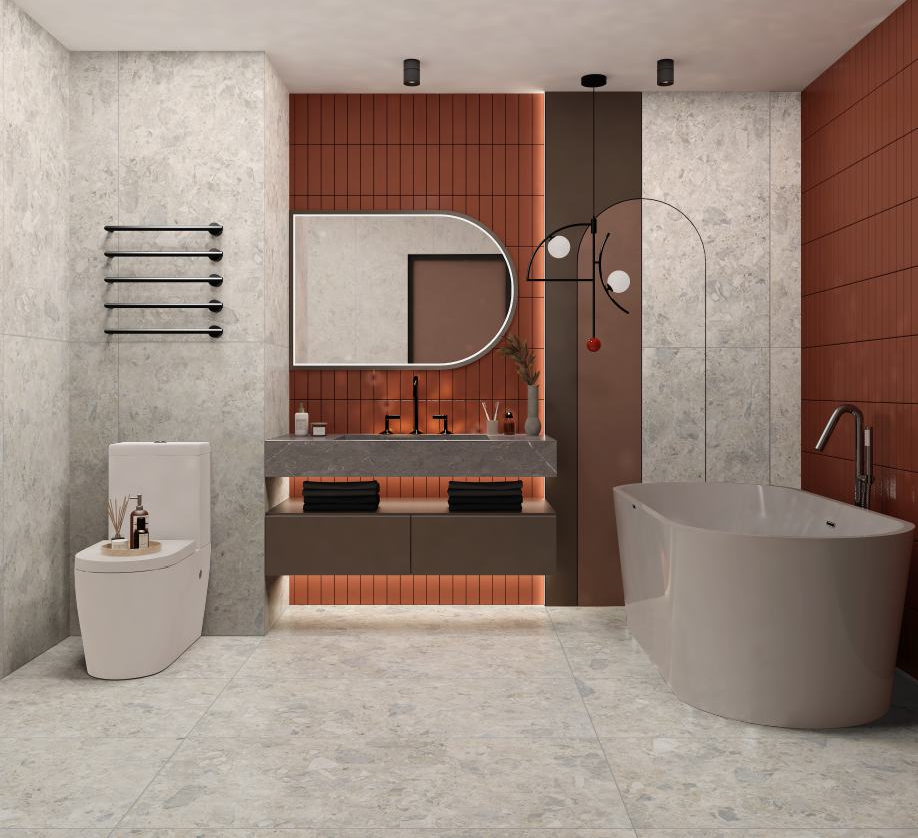 중간 톤의 그레이 컬러에 클래식 테라조 패턴이 조화를 이루는 타일로,
